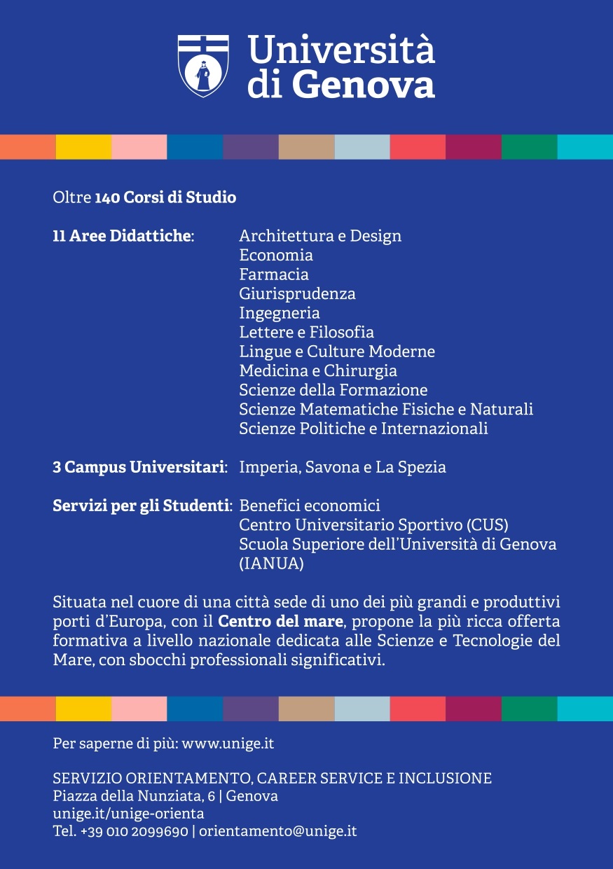 L’offerta formativa dell’Università di Genova si articola in Corsi di Laurea Triennali, Corsi di Laurea Magistrali e Magistrali a ciclo unico. Vanta inoltre una ricca offerta post laurea attraverso Scuole di specializzazione, Dottorati di ricerca, Master universitari e Corsi di perfezionamento.